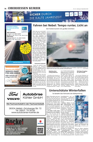 Fahren bei Nebel: Tempo runter, Licht anDer Herbst kommt mit gro%u00dfen Schritten(ZDK). Man muss nicht Kultfilme wie %u00bbThe Fog %u2013 Nebel desGraues%u00ab sehen, um den Horrordicker Nebelschwaden zu erleben. Jeder Autofahrer istschon einmal pl%u00f6tzlich in diewabernde Suppe eingetaucht.Das Grauen kommt h%u00e4ufig imHerbst und Winter, in denMorgen- und Abendstunden,auf Landstra%u00dfen, in T%u00e4lern,Senken und Gew%u00e4ssern%u00e4he.Schaurig-gef%u00e4hrlich wird es,wenn wie aus dem Nichtsdann Reh oder der Gegenverkehr erscheinen. Rund 300 Unf%u00e4lle mit Personenschaden gingen laut Statista 2024 auf dasKonto von Nebel, satte 103mehr als im Vorjahr. H%u00e4ufigeUrsachen: zu geringer Abstandund %u00fcberh%u00f6hte Geschwindigkeit. Autofahrer haben es alsooft selbst in der Hand, der Gefahr zu begegnen %u2013 mit vorausschauendem Fahren, aberauch mit Sicherheitsfeatureswie Nebelleuchten.Fahrweise anpassenTaucht die t%u00fcckische Wandschlagartig auf, orientierensich viele Autofahrer instinktiv an den R%u00fcckleuchten desVorausfahrenden und kommen ihm gef%u00e4hrlich nah. Wenig Zeit, im Notfall rechtzeitigzu bremsen.Daher gilt: runter vom Gas!Bei einer Sicht unter 100 Meter maximal Tempo 80 fahren,bei einer Sichtweite unter 50Meter nicht schneller als 50km/h. Orientierung geben aufLandstra%u00dfen und Autobahnendie Leitpfosten, die am Stra%u00dfenrand im 50-Meter-Abstandstehen. Am besten h%u00e4lt manauch die Fahrbahnmarkierungim Auge.Nebelleuchtenrichtig bedienenSie hei%u00dfen nicht umsonst so:Nebelscheinwerfer und Nebelschlussleuchte. Also an mitden Lichthilfen, aber bitte korrekt. Nebelscheinwerfer sitzentief am Auto und leuchten denBereich direkt vor dem Fahrzeug als auch den seitlichenFahrbahnrand aus. Dadurchblenden sie Autofahrer undEntgegenkommende weniger.Laut Stra%u00dfenverkehrsordnungd%u00fcrfen sie nur bei erheblicherSichtbehinderung durch Nebel, Regen oder Schnee eingeschaltet werden. Jeglicher anderer Gebrauch wird mit 20bis 35 Euro bestraft. Nebelscheinwerfer k%u00f6nnen, m%u00fcssenaber nicht strahlen. Nebelschlussleuchten am Fahrzeugheck machen das Auto f%u00fcr dennachfolgenden Verkehr fr%u00fchersichtbar und geben damit Orientierung. Zugleich warnensie vor Auffahrunf%u00e4llen.Wichtige Vorgabenf%u00fcr den EinsatzErst ab einer Sichtweite vonunter 50 Metern darf sie leuchten. Und das Tempo sollte 50km/h nicht %u00fcberschreiten. Werdas missachtet, riskiert Bu%u00dfgelder zwischen 20 und 35Euro. Nebelschlussleuchtenk%u00f6nnen auch innerorts eingeschaltet werden und sind generell wie Nebelscheinwerferkeine Pflicht.Nebelschlussleuchten d%u00fcrfen nur bei dichtem Nebel unter 50 Meter angeschaltet werden. Au%u00dferdem darf man dann nicht schneller als 50 km/h fahren. Foto: ProMotorUntersch%u00e4tzte WinterfallenSo besteht das Fahrwerk die K%u00e4ltepr%u00fcfung(DJD). Winterreifen sind unerl%u00e4sslich, um mit dem Kfz sicher durch die kalte Jahreszeitzu kommen. Wer bei winterlichen Stra%u00dfenverh%u00e4ltnissen mituntauglicher Bereifung unterwegs ist, dem drohen nebenUnfallgefahren sogar Bu%u00dfgelder. Der Umstieg auf Winterr%u00e4der ist eine gute Gelegenheit,auch das gesamte Fahrwerk genauer unter die Lupe nehmenzu lassen.Die Reifen: Profil zeigen.Die gesetzlich vorgeschriebeneProfiltiefe liegt bei 1,6 Millimeter %u2013 viel zu wenig, um beiSchnee oder N%u00e4sse sicher zubremsen und in der Spur zubleiben. Die Experten desDeutschen Kraftfahrzeuggewerbes empfehlen eine Mindesttiefe von vier Millimetern.Nach sechs bis acht, sp%u00e4testenszehn Jahren sollten die Pneusgetauscht werden, da die Elastizit%u00e4t nachl%u00e4sst und der Gummi verspr%u00f6den kann. Die KfzWerkstatt kann Alter und Zustand pr%u00fcfen.Die Sto%u00dfd%u00e4mpfer: Stabilauf der Fahrbahn. DefekteSto%u00dfd%u00e4mpfer k%u00f6nnen denBremsweg verl%u00e4ngern und dieFahrstabilit%u00e4t auf winterlichenStra%u00dfen beeintr%u00e4chtigen. BeiVerschlei%u00dfzeichen wie ungleichm%u00e4%u00dfiger Reifenabnutzung oder Ger%u00e4uschen bei Bodenunebenheiten ist ein Besuch in der Kfz-Werkstatt angeraten.Lenkung: Pr%u00e4zise in derSpur. Ungew%u00f6hnliches Spieloder Schwerg%u00e4ngigkeit k%u00f6nnen die Kontrolle %u00fcber dasFahrzeug bei glatten Stra%u00dfenverh%u00e4ltnissen zus%u00e4tzlich erschweren. Die Lenkung musspr%u00e4zise und leichtg%u00e4ngig sein,um das Auto jederzeit sicherauf Spur zu halten.Bremsen: Sicher auf Null.Neben den Bremsbel%u00e4gen sollten vor dem Winter auch dieBremsscheiben und -s%u00e4ttel sowie die Bremsleitungen kontrolliert werden. Abnutzungen,Korrosion oder festsitzendeTeile k%u00f6nnen zu schlechtererVerz%u00f6gerung f%u00fchren, was besonders in der kalten Jahreszeit gef%u00e4hrlich ist. Die Bremsfl%u00fcssigkeit kann Wasser aufnehmen und die Bremskraftverringern, ein Wechsel wirdalle zwei Jahre empfohlen.Assistenzsysteme: Zuverl%u00e4ssige Helfer. Assistenzsysteme wie das Anti-Blockier-System (ABS) und das Elektronische Stabilit%u00e4tsprogramm (ESP)sind im Winter besonderswichtig, um das Fahrzeug inbrenzlichen Situationen aufder Stra%u00dfe zu halten. Eventuelle Probleme oder Fehlfunktionen lassen sich aus dem Fehlerspeicher auslesen.Zu einem Wintercheck des Kfzgeh%u00f6rt die Kontrolle derBremsanlage. Foto: DJD/Kfz-GewerbeSchlitzer Str. 17-19 %u2022 36341 LauterbachTel. 06641/3008 %u2022 Fax 06641/919066E-Mail info@suzuki-lauterbach.dewww.suzuki-lauterbach.deAutodienst GmbHSuzuki-Service-PartnerTel. 0 66 31/70 88 83 I Aulastra%u00dfe 19 I 36304 Alsfeld-Eifawww.autoservice-marko-becker.deReparatur aller MarkenSERVICE-PAKETF%u00dcR IHRE R%u00c4DERR%u00e4der wechseln undeinlagern jetzt 38 %u20acKostenloserLichtTest!www.tuev-hessen.de T%u00dcV%u00aeKostenloser Lichttest -wir freuen uns auf IhrenBesuch!36367 AngersbachIm Tiegel 5 l Tel.: 06641 644878MO+MI: 9-17 Uhr l FR:13-17 Uhr l SA: 8-12 Uhr36304 AlsfeldGr%u00fcnberger Stra%u00dfe 76 l Tel.: 06631 919376MO-FR: 8-17 Uhr l SA: 8-13 Uhr16 OBERHESSEN KURIER Nr. 38|Samstag, 20. September 2025