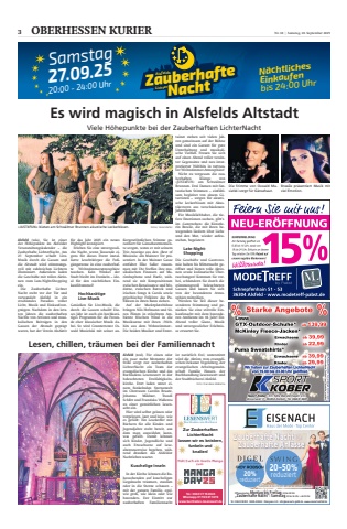 Es wird magisch in Alsfelds AltstadtViele H%u00f6hepunkte bei der Zauberhaften LichterNachtAlsfeld (wia). Sie ist einerder H%u00f6hepunkte im AlsfelderVeranstaltungskalender %u2013 dieZauberhafte LichterNacht. Am27. September schallt LiveMusik durch die Gassen unddie Altstadt wird stimmungsvoll mit zahlreichen Lichternilluminiert. Au%u00dferdem ladendie Gesch%u00e4fte mit tollen Aktionen zum Late-Night-Shoppingein.Die Zauberhafte LichterNacht steht vor der T%u00fcr undverwandelt Alsfeld in einstrahlendes Paradies vollerLicht, Musik und Einkaufsvergn%u00fcgen. Nachdem in den letzten Jahren die zauberhaftenN%u00e4chte von Artisten und musikalischen Beitr%u00e4gen in denGassen der Altstadt gepr%u00e4gtwaren, hat der Verein AlsAktivf%u00fcr das Jahr 2025 ein neuesHighlight konzipiert.Erleben Sie eine unvergessliche Nacht, wenn Tausende eigens f%u00fcr dieses Event installierte Leuchtk%u00f6rper die Fu%u00dfg%u00e4ngerzone in eine zauberhafte Wohnzimmeratmosph%u00e4retauchen. Kein Winkel derStadt bleibt im Dunkeln %u2013 ideal f%u00fcr den n%u00e4chtlichen Einkaufsbummel!Hochkar%u00e4tigeLive-MusikGenie%u00dfen Sie Live-Musik, diedurch die Gassen schallt! Dieses Jahr ist auch ein hochkar%u00e4tiges Programm f%u00fcr die Freunde eher klassischer Musik dabei. So wird Countertenor Oswald Musielski mit seiner au%u00dfergew%u00f6hnlichen Stimme garantiert f%u00fcr G%u00e4nsehautmomente sorgen, wenn er mit seinemTrio Ausz%u00fcge aus den %u00bbBest ofMusicals%u00ab am Mainzer Tor pr%u00e4sentiert. In der Mainzer Gasseentfaltet Elke Saller zusammen mit Ute Steffan ihre musikalischen Finessen auf Marimbaphone und Harfe, w%u00e4hrend sie mit Kompositionenzwischen Renaissance und Moderne, zwischen Barock undirischen Songs & Carols sowiegriechischer Folklore das Publikum in ihren Bann ziehen.Auf der Marktplatzb%u00fchnebringen Nils Hofmann und S%u00f6ren Flimm in stilechtem Ambiente frischen Wind in dieMusikszene mit ihren %u00bbWelthits aus dem Wohnzimmer%u00ab.Die beiden Musiker und Entertainer stehen seit vielen Jahren gemeinsam auf der B%u00fchneund sind ein Garant f%u00fcr guteUnterhaltung und musikalische Vielfalt. Freuen Sie sichauf einen Abend voller vereinter Gegens%u00e4tze und neu interpretierter Welthits in vertrauter Wohnzimmer-Atmosph%u00e4re!Nicht zu vergessen die zauberhaften Kl%u00e4nge von%u00bbJUST4FUN%u00ab am Schw%u00e4lmerBrunnen. Drei Damen mit fantastischen Stimmen %u2013 einf%u00fchlsam begleitet von einem Gitarristen %u2013 sorgen f%u00fcr akustische Leckerbissen mit Akustikcovern aus verschiedenenJahrzehnten.F%u00fcr Musikliebhaber, die tiefere Emotionen suchen, gibt%u2019sim %u00bbLaternchen%u00ab die K%u00fcnstlerin BreeZe, die mit ihren bewegenden Liedern %u00fcber Liebeund den Mut, wieder aufzustehen, begeistert.Late-NightShoppingDie Gesch%u00e4fte und Gastronomie haben bis Mitternacht ge%u00f6ffnet und bieten tolle Aktionen sowie kulinarische %u00dcberraschungen! Kommen Sie vorbei, schlendern Sie durch diestimmungsvoll beleuchtetenGassen und lassen Sie sichvon der besonderen Atmosph%u00e4re mitrei%u00dfen.Werden Sie Teil dieser besonderen Stimmung und genie%u00dfen Sie eine stilvolle Einkaufsnacht mit dem besonderen Ambiente im 18. Jahr! EinAbend voller Glanz, Musikund unvergesslicher Erlebnisse erwartet Sie.Die Stimme von Oswald Musielski sorgt f%u00fcr G%u00e4nsehaut.BreeZe pr%u00e4sentiert Musik mitviel Emotion.%u00bbJUST4FUN%u00ab bieten am Schw%u00e4lmer Brunnen akustische Leckerbissen. Fotos: VeranstalterLesen, chillen, tr%u00e4umen bei der FamiliennachtAlsfeld (red). F%u00fcr einen oderein paar mehr Momente derStille sorgt zur zauberhaftenLichterNacht ein Team derevangelischen Kirche und desBuchladens Lesenswert in derbeleuchteten Dreifaltigkeitskirche. Dort laden unter einem funkelnden Sternenzeltim Chorraum Carolin Braatz,Johanna Mildner, TraudiSchlitt und Franziska Wallentazu einer gem%u00fctlichen Lesenacht ein.Hier wird selbst gelesen odervorgelesen, laut und leise, wiees gef%u00e4llt: Ein Lesekoffer mitB%u00fcchern f%u00fcr alle Kinder- undJugendjahre steht bereit, ausdem man ausw%u00e4hlen kann,was gef%u00e4llt. Damit k%u00f6nnensich Kinder, Jugendliche undauch Erwachsene auf Leseabenteuerreise begeben, w%u00e4hrend drau%u00dfen das AlsfelderNachtleben wartet.Kuschelige InselnIn der Kirche k%u00f6nnen die Ruhesuchenden auf kuscheligenLiegeinseln tr%u00e4umen, staunenoder in die Sterne schauen %u2013mit der ganzen Familie, egal,wie gro%u00df, wie klein oder wiebesonders. Der Eintritt zurzauberhaften Familiennachtist nat%u00fcrlich frei; unterst%u00fctztwird die Aktion vom evangelischen Dekanat Vogelsberg, derevangelischen Arbeitsgemeinschaft Familie Hessen, derBuchhandlung Lesenswert undder Stadtb%u00fccherei Alsfeld.Foto: Franziska WallentaN%u00e4chtlichesEinkaufen27bis 24:00 Uhr.09.25Samstag20:00 - 24:00 UhrNachtZauberhafte uberhafteAlsfeldsLichter%LowaStarke Angebote %GTX-Outdoor-Schuhe* ab 139,99McKinley Fleece-Jacken* Erwachsene ab 39,99 Kinder ab 22,99Puma Sweatshirts* Erwachsene ab 39,99 Kinder ab 29,99 *Auslaufmodelle, nur solange Vorrat reicht Verschiedene Farben und Modelle vorr%u00e4tig.Wir haben zur Zauberhaften LichterNachtvon 19.00 bis 23.00 Uhr ge%u00f6ffnet.Tel.: 06631 96190 %u00b7 36304 Alsfeld %u00b7 Obergasse 2+5 %u00b7 info@eisenach-gmbh.de %u00b7 www.eisenachalsfeld.de%u00d6ffnungszeiten:Montag bis Freitag, 10 bis 18 Uhr%u201eZauberhafte Nacht%u201c: Samstag, 10 bis 14 Uhr + ab 19 UhrZauberhafte Nachtf%u00fcrZauberhafte Anl%u00e4sset bi F it*G%u00fcltig vom 24. bis 27.09.25 und nur auf vorhandene Ware.20%reduziert20-50%reduziert**Holt Euch ein Gratis MangazumTel.: 06631/7762345Whatsapp 0170/3211878www.buchladen-lesenswert.deZur ZauberhaftenLichterNachtlassen wir es knistern,funkeln undknallen!RRRRRR3 OBERHESSEN KURIER Nr. 38|Samstag, 20. September 2025