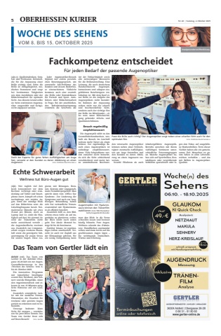 Echte SchwerarbeitWellness tut B%u00fcro-Augen gut(djd). Wer t%u00e4glich viel Zeithoch konzentriert vor demRechner verbringt oder stundenlang auf Tablet und Smartphone starrt, k%u00e4mpft oft schonnachmittags mit m%u00fcden Augen. Denn der st%u00e4ndige Blickauf den Bildschirm setzt dieLidschlagfrequenz herab. Normalerweise blinzeln wir etwa15-mal pro Minute, doch anLaptop und Co. sinkt die H%u00e4ufigkeit auf drei- bis viermal. Sowird der Tr%u00e4nenfilm nichtmehr ausreichend verteilt %u2013die Augenoberfl%u00e4che trocknetaus. Zus%u00e4tzlich zur Computerarbeit sorgen trockene Raumluft sowie die gesteigerte Sehanstrengung f%u00fcr puren Stressf%u00fcr unsere Augen. Diese reagieren mit R%u00f6tungen, Brennen, Kratzen oder unangenehmem Fremdk%u00f6rpergef%u00fchl. Manspricht dann vom %u00bbOffice EyeSyndrom%u00ab. Zur Linderung derSymptome und auch zur langfristigen Behandlung habensich frei verk%u00e4ufliche Tr%u00e4nenersatzmittel mit Hyalurons%u00e4ure als effektiv bew%u00e4hrt.Zus%u00e4tzlich hilft es, den Bildschirm etwas tiefer als auf Augenh%u00f6he zu platzieren, sodassder Blick leicht nach untengeht. Der ideale Abstand betr%u00e4gt 50 bis 60 Zentimeter.Dar%u00fcber hinaus ist regelm%u00e4%u00dfiges L%u00fcften unerl%u00e4sslich: Vorsicht ist auch vor Zugluft ausder Klimaanlage geboten. F%u00fcrein wenig Entspannung kannman den Blick in die Ferneschweifen lassen und bewussth%u00e4ufig blinzeln. Pure AugenWellness schenkt das %u00bbPalmieren%u00ab: Handfl%u00e4chen aneinanderreiben und dann leicht auf diegeschlossenen Augen legen %u2013f%u00fcr wohltuende Dunkelheit,W%u00e4rme und Erholung.Fachkompetenz entscheidetF%u00fcr jeden Bedarf der passende Augenoptiker(akz-o). Qualit%u00e4tsdenken, Sorgfalt und Profession: Kriterien,die f%u00fcr die Anpassung einerBrille wichtig sind. Denn dieBrille ist Alltagsbegleiter, modisches Statement und sorgtbei bestimmten T%u00e4tigkeitenwie dem Autofahren oder derBildschirmarbeit f%u00fcr optimaleSicht. Aus diesem Grund solltesie beim station%u00e4ren Augenoptiker ausgew%u00e4hlt und fachgerecht angepasst werden.Jeder Augenoptiker-Besuchbeginnt mit einem pers%u00f6nlichen Beratungsgespr%u00e4ch, umeventuelle Seh-Probleme desKunden und dessen Bed%u00fcrfnisse einzusch%u00e4tzen. Vielleichtkommen auch eine zus%u00e4tzliche Brille oder Kontaktlinsenf%u00fcr Freizeit und Sport, Autofahren oder Bildschirmarbeitin Frage. Bei der anschlie%u00dfenden Refraktionsbestimmungermitteln die Seh-Profis dieArt der Fehlsichtigkeit sowiealle notwendigen Messwertef%u00fcr die Brillenerstellung. EineLeistung, die nach deutschemHandwerksrecht Augenoptikermeistern und ad%u00e4quat ausgebildeten Berufstr%u00e4gern vorbehalten ist. Mit dem Kauf einer Brille ist die Aufgabe desAugenoptikers nicht beendet:Im Rahmen der Anpassungstehen nicht nur die scharfeund beschwerdefreie Sicht,sondern auch der richtige Sitzder Brille im Mittelpunkt %u2013 alles stets unter Ber%u00fccksichtigung geltender Arbeits- undQualit%u00e4tsrichtlinien.Besuch regelm%u00e4%u00dfigempfehlenswertDie Augenoptik z%u00e4hlt zu denGesundheitshandwerken, weshalb ein Besuch im Gesch%u00e4ftweitaus mehr bietet als einenSehtest. Der regelm%u00e4%u00dfige Besuch eines Augenoptikers istunbedingt empfehlenswert,denn: Viele Sehprobleme werden zun%u00e4chst nicht bemerkt,da sich die Sicht schleichendverschlechtert und meist keine unmittelbaren Beschwerden verursacht. Augenoptikerk%u00f6nnen neben einer Fehlsichtigkeit eventuelle Auff%u00e4lligkeiten am Auge feststellen undden Kunden zu deren Abkl%u00e4rung an einen Augenarzt verweisen.Sowohl Filialisten als auchinhabergef%u00fchrte AugenoptikBetriebe sprechen mit ihremvielf%u00e4ltigen Sortiment unterschiedliche Personengruppenan. Manche Augenoptiker haben sich auf Sportbrillen, Kontaktlinsen oder vergr%u00f6%u00dferndeSehhilfen spezialisiert oder legen den Fokus auf ausgefallene Markenbrillen. Trotz dieserVielfalt haben alle ein gemeinsames Ziel: Menschen zu gutem Sehen in allen Lebensbereichen verhelfen %u2013 und dasmit Brillen in AugenoptikerQualit%u00e4t.Passt die Brille auch richtig? Der Augenoptiker sorgt neben einer scharfen Sicht auch f%u00fcr denoptimalen Sitz. Foto: ZVA/Peter Boettcher/akz-oStellt der Experte f%u00fcr gutes Sehen Auff%u00e4lligkeiten am Augefest, verweist er den Kunden zu deren Abkl%u00e4rung an einenAugenarzt. Foto: ZVA/Peter Boettcher/akz-oDas Team von Gertler l%u00e4dt einAlsfeld (red). Das Team vonGertler in der Alsfelder Obergasse 26-28 l%u00e4dt ein zur AugenGesundheitsvorsorge in den%u00bbWochen des Sehens%u00ab vom 6.bis 18. Oktober 2025.Ein innovatives Programmmit k%u00fcnstlicher Intelligenzscannt Ihre Netzhaut, den Sehnerv und die Blutgef%u00e4%u00dfe, misstden Augeninnendruck und erkennt in nur 15 Minuten m%u00f6gliche Hinweise auf ein Glaukom.Zus%u00e4tzlich erm%u00f6glicht Gertler mit der moderne Tr%u00e4nenfilmanalyse, die Ursachen f%u00fcrtrockene oder gereizte Augengezielt zu erkennen und zu behandeln.Vorsorge bedeutet klareSicht f%u00fcr morgen %u2013 vereinbaren Sie jetzt Ihren Termin. DasTeam von Gertler freut sichauf Ihren Besuch! Foto: GertlerAugentropfen mit Hyalurons%u00e4ure k%u00f6nnen den Tr%u00e4nenfilmstabilisieren. Foto: TRB Chemedica/Getty Images/Andrii BorodaiVOM 8. BIS 15. OKTOBER 20255 OBERHESSEN KURIER Nr. 40|Samstag, 4. Oktober 2025